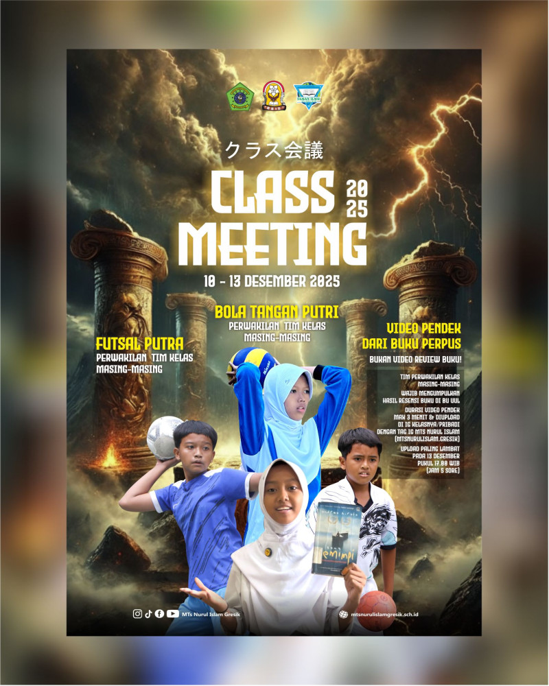 Ikuti dan meriahkan kegiatan Class Meeting MTs Nurul Islam 2025 pada tanggal 10 - 13 Desember 2025. Berbagai macam lomba dan dukung terus tim kelas kalian ya✨